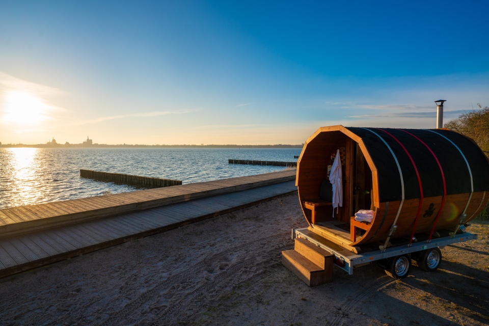 Die Fass-Sauna steht auf einem Anhänger steht, du kannst sie dort genießen, wo du dich am wohlsten fühlst: in Altefähr, in Stralsund oder an deinem Lieblingsort auf Rügen.
